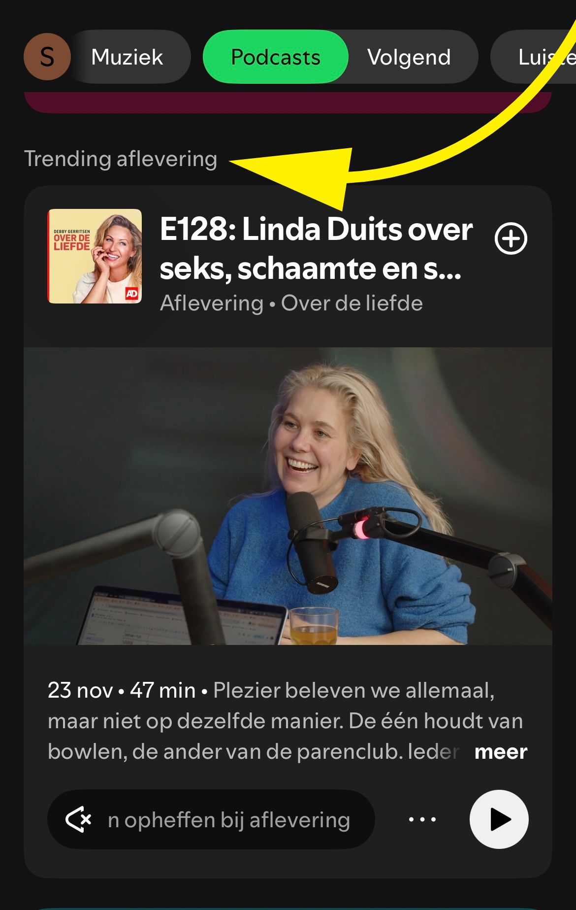 Hieronder een voorbeeld van een Trending aflevering in de podcastfeed van Spotify👇