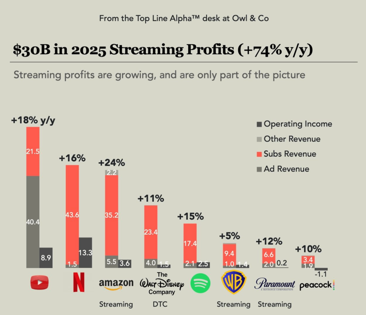 Netflix, YouTube, Amazon, Disney, Spotify, Warner Bros., Paramount en Peacock maakten samen $30 miljard dollar winst in 2025. Een stijging van 74 procent ten opzichte van een jaar eerder (!)