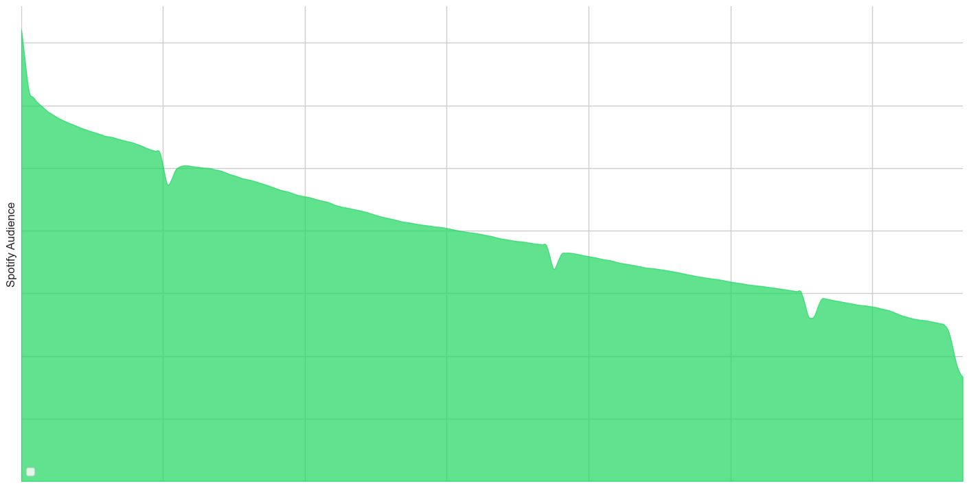 De retentie grafiek in Spotify, beschikbaar in Spotify for Creators. De advertenties zijn geplaatst op de drie plekken waar je een kleine ‘dip’ ziet (Bron: Bumper)
